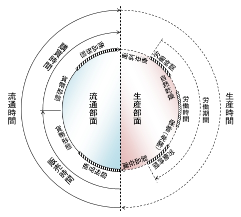 この章は、「流通時間」、すなわち「販売時間」と「購買時間」について、資本の回転に及ぼす影響を論じています。「資本の回転時間」=「資本の生産時間」+「資本の流通時間」ですから、全体は下のようにイメージになります。