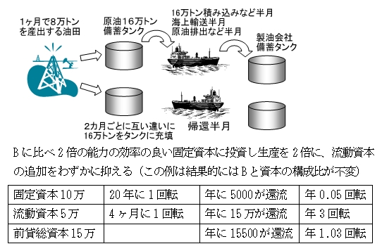 下のAの例は1ヶ月に4万トンの原油を産出する油田で、16万トンを備蓄してからタンカーで3ヶ月かけて輸出販売し、売上金(手形)をもって1ヶ月をかけてタンカーが帰還するという例です。流動資本の回転期は4ヶ月+4ヶ月=8ヶ月となりますが、これがaタンク系列、bタンク系列が互い違いに回転します。固定資本は20年、流動資本は8ヶ月で1回転し、前貸総資本は年に0.78回転となります。
