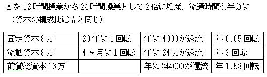 結果的に、資本の構成比率がBと同じになり、前貸総資本の回転速度は変わりません。では、油田で実際にそうしているように、操業時間を12時間から24時間連続操業にしてみましょう。