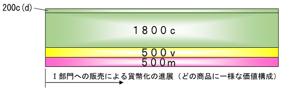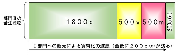 となります。しかしマルクスは、ykbdataをはじめ読者がが「マルクスがこんな勘違いをしているのでは」と思うだろうことはすべてわかっていて、p737で部分1が「…その摩滅価値の一部分をすでに実現したかもしれない。しかし、彼らにとっては200の貨幣がまだこれから実現されるべきものである。」と述べています。つまり、「実現」(貨幣を介した現物での補填)と「沈殿分としての貨幣化」は同一ではなく、下の方の図で言えばどんな商品にも潜む200c(d)の加除部分が一時的に貨幣化されてもすぐに不変資本や可変資本に転換されることとは別に、明示的に(資本家の意識として、シーニアの最後の1時間のように、「最後の200c(d)」」が)貨幣化して「沈殿」する(積み立てられる)のは上の図の最後の200c(d)の操作である、と言っているのだと思います。