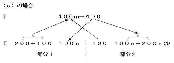 なんと、部分1が固定資本の現物での更新のために前貸しした200が、Tを介して部分2に還流したと言っているわけです。総資本として見れは確かに成り立ちます。ただし、部分1と部分2の流動的不変資本の比率が2分の1ずつだというのは現実離れしています。(ykbdataのシミュレーションを見よ)(a)の場合を表式で表すと下のようになります