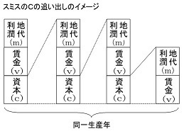 これは生産過程を見ないスミスは、「資本」(労賃)を投下した時点で、商品の価値に「資本」(労賃)が入り込むと勘違いしている。実際は生産過程で資本が投下した「資本」(労賃)分の価値が生産物に付け加えられるのだと言っているのです。