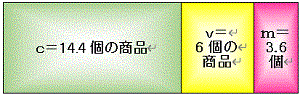 1つ目は不変資本c、可変資本v、剰余価値mをシーニア風に生産された商品の量で表します。不変資本価値は12シリングだから、販売価格合計20シリングである商品24個の20分の12=14.4個の商品で補填される。必要労働時間(可変資本価値=労働力の価値=賃金に相当)は5シリングだから販売価格合計20シリングである24個の20分の5=6.0個で表される。剰余労働時間(剰余価値を生産する時間)は剰余価値が残りの3.6個の商品で表される。(Bp563BP555)これを図にすると