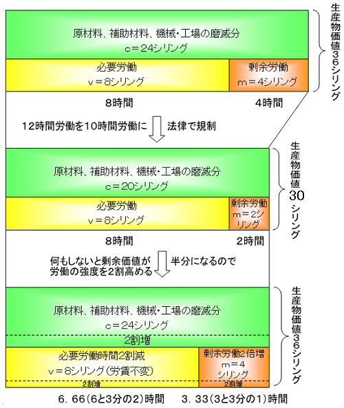 すなわち、夫(成年男性)だけの場合の必要労働時間と剰余労働時間の比は6時間対6時間から、家族全成員に分割された場合の合計の必要労働時間と剰余労働時間の比は8時間対28時間に変化します。ただし、妻の労賃は夫の半分、さらに児童の労賃はそのまた半分で、児童の労働時間は夫の半分と仮定しました。