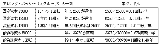 (五)項は回転時間の違う3種類の資本の総回転の計算例を、イギリスのスクループから流用したアメリカの経済学者アロンゾ・ポッターからの引用しています。読んでもらえば結構ですが、最初の例だけ表にしてみましょう。前貸し総資本の回転時間の差異は訳注*2を見てください。