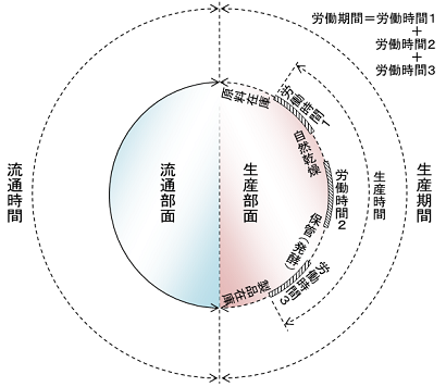 この章で論じられているのは、「生産時間、すなわち資本が生産部面に拘束されている時間」です。ただし、生産時間がすべて労働時間ではありません。例によって図(2023/9/12修正、修正前はこちら)で表すと