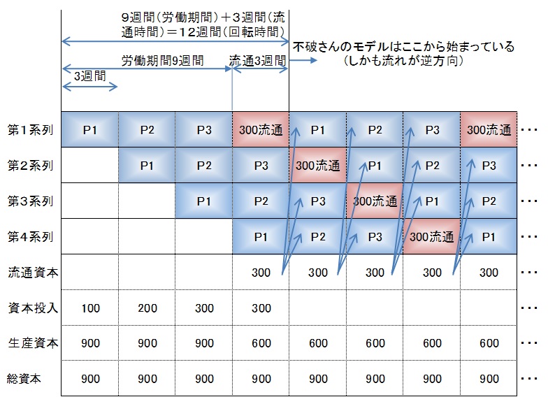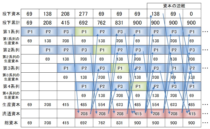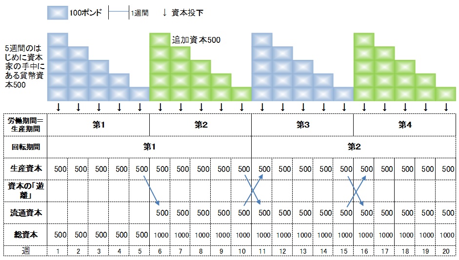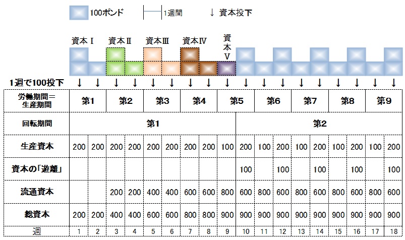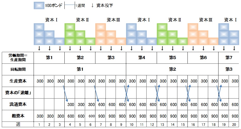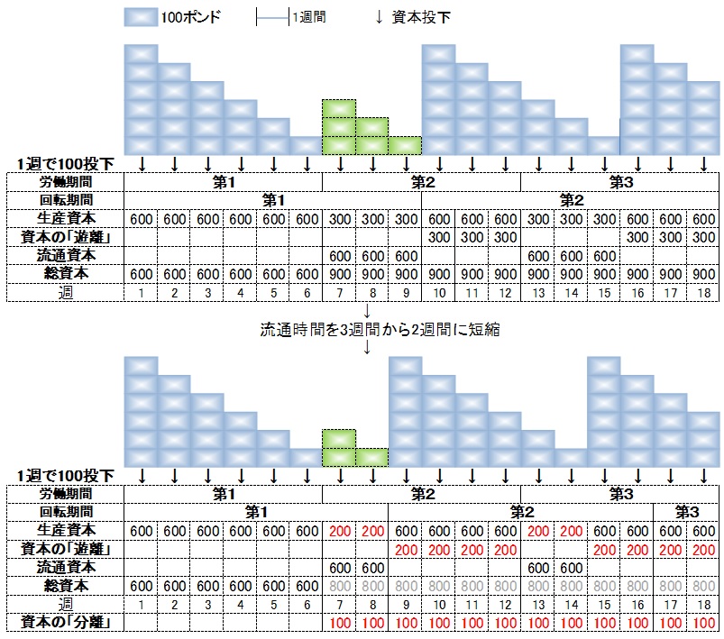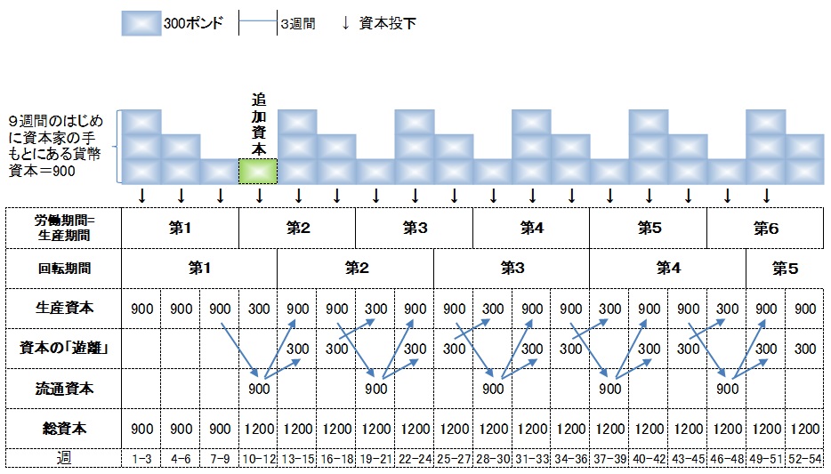 p418末尾からの「第三例」は、「第一例」で9週間とされた労働期間を6週間にした例で、ここでも流通時間3週間分の300ポンドが3週間(流通時間の3週間というわけでなく)「遊離」されるわけです。(下図)
