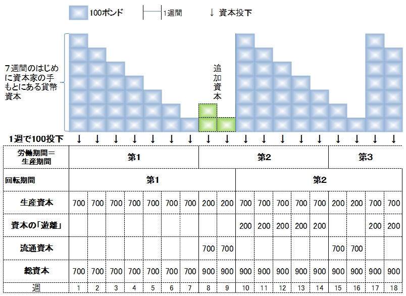 付け加えれば、遊離される期間は、流通時間内の最後の労働期間の端数と労働期間の長さの差だけ、この場合は流通時間5週間を第3の労働期間が満たした最初の1週間と労働期間4週間との差、すなわち3週間です。第2節の最後の例の逆とすると、すなわち労働期間2週間、流通時間7週間とすれば、資本はそれぞれ200の資本T、U、V、Wと100の資本Xとして投下され、この半端の100ポンドが各労働期間ごとに1週間遊離されるということになります。