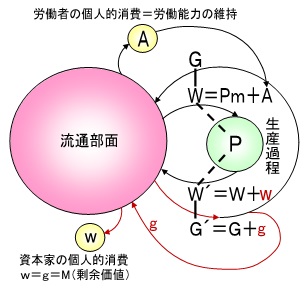 初めの部分は前提条件で、回転論の「貨幣資本の循環」の図解(上図)が参考になるでしょう。この図で、労働が新たにつけ加えた剰余価値gを実現する貨幣はどこから来るかということです。