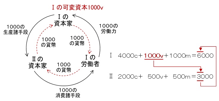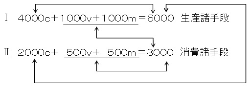 付け加えれば、Uの消費諸手段3000のうち2000c相当部分は、(1000v+1000m)Tすなわち、T部門の可変資本価値と剰余価値との交換で価値補填され(イメージ図ではTとUのあいだのA)、その価値が次にTの生産諸手段6000のうち2000と交換され素材補填される(同TとUの外側を回るA)ということになり、「貨幣の媒介無視する」といいながら、この2段階の補填は貨幣に媒介されざるを得ません。この辺が、以後の論述を複雑にしています。