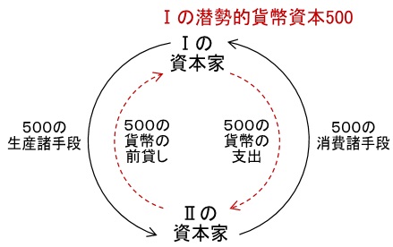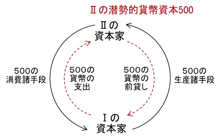 すなわち「潜勢的貨幣資本」(「収入」、「資本の遊離」あるいは「資本の分離」などで)として「ある程度の手持ち貨幣が…資本家の手中にあるものと前提されなければならない。」と、Uの資本家に500の貨幣を不変資本への前貸しとして支出させます。つまりUに前述の1000に加えてさらにTの500の生産諸手段を買わせます。(それでもまだTには変換が必要な生産諸手段の500が残っている)