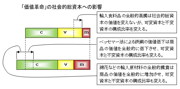 この単純再生産の順調な進行を妨げる要因の一つとして「価値革命」が取り上げられます。マルクスは、第三部で考察する一般的利潤率の形成で、商品価格が商品価値から乖離することについては、個々の資本には影響あるが、社会的に見れば逆方向の乖離が打ち消し合って影響はないと、まさに「ついでに」言及します。(p630)