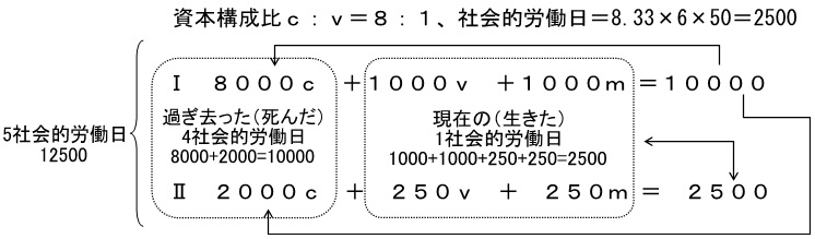 次は現代資本主義社会に近い想定です。不変資本が大きく、「死んだ労働」(過去の抽象的人間労働)10000が主役です。死者が生者をとらえる!面白いですね。