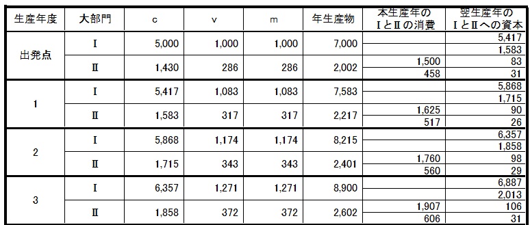 先回りして、マルクスが計算した再生産3年目まで(p852)の進行表を示します。最下位桁の数字がほんの少し違うのはマルクスの出発点の計算ミスのためです。(なぜ31が出てきたか?)