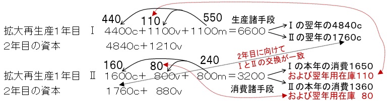 その翌年に向けてのTの不変資本110を機能させるめにUの本年の剰余価値から可変資本55を汲み出す。つまりUの資本家がさらに本年"節欲″して消費しない商品55が余り、翌年のUの消費に向けての商品在庫となる。これでUの翌年向けの商品在庫は25+55=80となる。