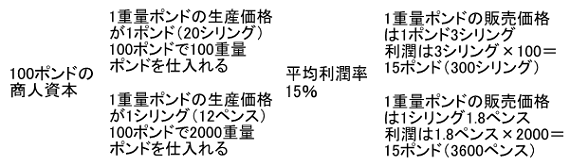 マルクスは例として、一般的利潤率が15%のもとで、100ポンドの商人資本が年1回転するとすると、100ポンドの商品に15ポンドを付け加えて115ポンドで売るが、同じ100ポンドの商人資本が年5回転する場合にも、彼が年に扱う500ポンドの商品にも75ポンドではなく、彼の前貸し資本の15%すなわち15ポンドを付け加えて515ポンドで売る、つまり100ポンドの商人資本は年1回転でも年5回転でも、年15ポンドしかつけ加えないというのです!