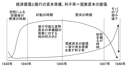 マルクスは原注(六四)で、トゥック(ロシア生まれのイギリスの実業家・経済学者、自由貿易主義者)は繁栄期の利子率の低下は停滞期に蓄蔵された剰余資本の、景気の回復を期待する解放で説明していると紹介しています。
