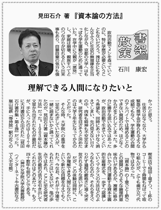 いよいよ、ykbdataの『資本論』の研究も、「信用論」と「地代論」を残すのみとなりました。研究を始めてすでに21年が経過しています。『資本論』は人生をかけて学ぶ価値があります。その辺を石川康宏さんが「しんぶん赤旗」(2023年6月4日付)の書評で語っています。