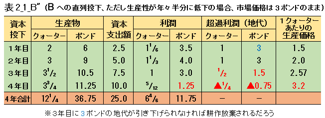 表V(p1239)に相当していますが、これまで(マルクスの表Tでも表Uでも、ykbdataの表U´でも)追加資本投下後の個別地代(超過利潤)率は第1次投下と不変でしたが、ここでは減る場合です。つまり。第2次投下資本額に対しする第2次の追加超過利潤額の比率が、第1次のそれより減るということで、絶対額の増減ではないので、「第2次資本投下が異なる土地種類に均等または不均等に…、超過利潤の生産の減少が同等な比率で行われるのか不等な比率で…配分されるかはどうでもよいこと」になります。これはすでに前章のykbdataの考察で明らかです。