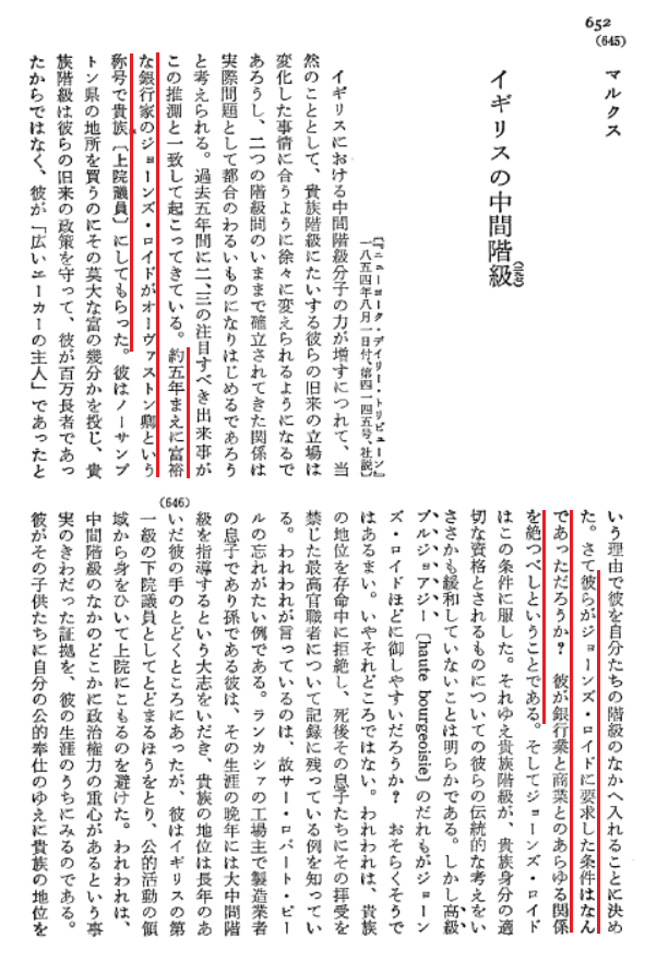 最後は、地主が製造業者を兼ねていたら、地代の下落は原材料の下落となり、製造業での儲けで穴埋めできるという話で締めています。しかし、農業を通して神聖な土地所有そのものから富が生まれるという封建的観念に凝り固まった地主が、自らが、労働者への過酷な搾取をしている、と批判してきた資本家に転身することは、オウヴァストンと逆の裏切りになり、地主階級の「道徳観」が許さなかったでしょう。借地農場経営者が、Aの耕作を放棄してそこにその借地農場経営者あるいは別の資本家が工場を建てることは大いにありそうな話ですが。