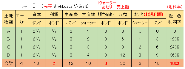 ここでは新たな事態を想定した表Yaが示されます。すなわちAの追加資本の生産性が1エーカー当たり1クォーターから3倍の3クォーター急速に増大しして1次投下の1クォーターと合わせて4クォーターとなって市場価格が1クォーター3ポンドから1.5ポンド(6ポンド÷4クォーター)に半減した場合、生産性の増大が緩慢なB(2→2.5合せて4.5クォーター)とC(3→5合せて8クォーター)では地代が減少し、生産性の増大がAと同じ3倍のD(4→12合せて16クォーター)の地代は変わらない(「増大し」は誤り)と言っています。表Yaの下の表Uと比べてみてください。