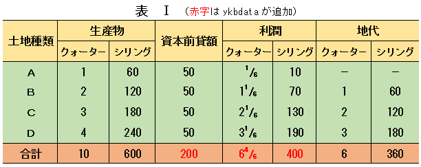 表[は、第1次投下の生産性が表Uから半減し(ここまでは表Zと同じで)、第2次投下では生産性が表Uと同じにしか回復しなかった場合で、収穫量合計が20から153/4に減少し、その逆の比率の4/3で販売価格が3ポンドから4ポンドに騰貴する場合です。したがって貨幣地代は表Uと変わりません。これは例えば、1年目が天候不順で凶作、2年目が例年並みの天候で作柄も例年並みに戻った場合です。