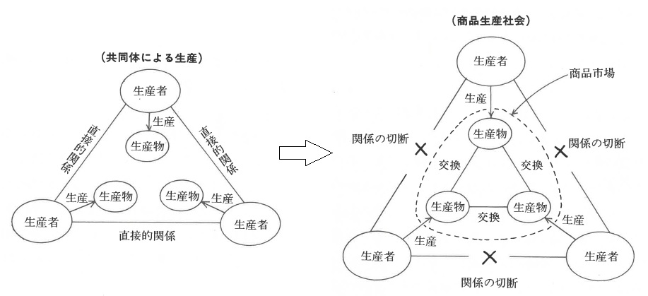 商品の交換は、法律的に発展していなくても商品所有者同士の意思によって行われる、それは経済的関係、すなわち経済的社会構成体によって「経済的諸関係の人格化」が行われる、と言っています。