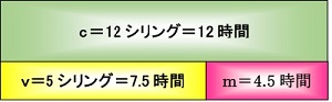 必要労働時間と剰余労働時間の比率は、以前は5対1だったがいまや5対3になります。「同じ結果は、次のようにしても得られる」と今度は不変資本c、可変資本v、剰余価値mを労働時間に換算します。すなわち