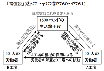 次は「補償説」と呼ばれる資本家の言い分です。機械導入で1500ポンドの生活手段が労働者から「遊離」するということは、資本家にとっては1500ポンドの資本が遊離することで、それは次の投資口で労働者と再会しなければならないのであり、その時は補償されるというのです。これを図にすると下のようになります。灰色の字が資本家の見方で、黒が実態です。