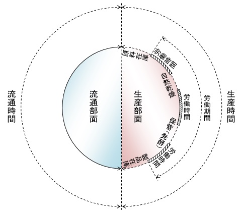 この章で論じられているのは、「生産時間、すなわち資本が生産部面に拘束されている時間」です。ただし、生産時間がすべて労働時間ではありません。例によって図(2023/9/12修正、修正前はこちら)で表すと