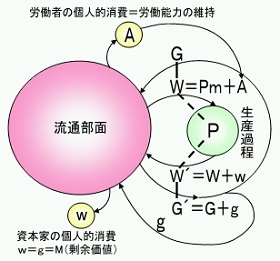 初めの部分は前提条件で、回転論の「貨幣資本の循環」の図解(上図)が参考になるでしょう。この図で、労働が新たにつけ加えた剰余価値gを実現する貨幣はどこから来るかということです。