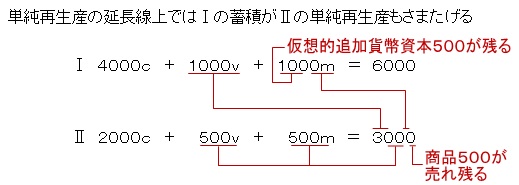 1500T(v+1/2m)と1500Ucとの転換は単純再生産過程の一過程であり、その限りではかたづいている。けれども、ここでなお若干の独自性蓄積する再生産の場合には1500T(v+1/2m)はUcだけによって補填されるのではなく、UcにUmの一部を加えたものによって補填されるということから生じる若干の独自性(だから余る!*ykb)