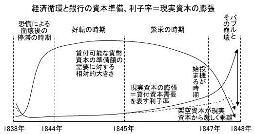 マルクスは原注(六四)で、トゥック(ロシア生まれのイギリスの実業家・経済学者、自由貿易主義者)は繁栄期の利子率の低下は停滞期に蓄蔵された剰余資本の、景気の回復を期待する解放で説明していると紹介しています。