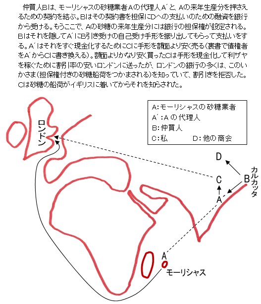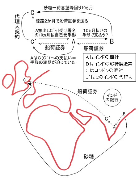 以前にロンドンの商社Cから綿糸を輸入して綿織物業者への委託販売をしていたであろう 「十分な信用のある」インドの商会Aは、Cへの綿糸代金の支払い期限が(手形の満期がくるとインドの銀行のAの口座からCの講座に代金が振り替えられる期限)が迫っていた。Aはその支払のために、インドの砂糖製造業者Bから(例えば10ヵ月払いの手形で)砂糖を買い、A受取人でC引き受けの(Cの代理人のC´が引受署名の)10ヵ月払いの自己受け手形を振り出す。Aはその手形をすぐさまAとC(あるいはC´)の口座のあるインドの銀行に持ち込み、割引を受けてAの自分の口座に現金を振り込み、Cへの支払い(A引受でC受取の手形の満期)に備える。(これでAは当面の難を逃れるが、Bへの支払いが10か月後に来る。)C´はAから受け取った船荷証券を、陸路でロンドンの本社Cに送る。