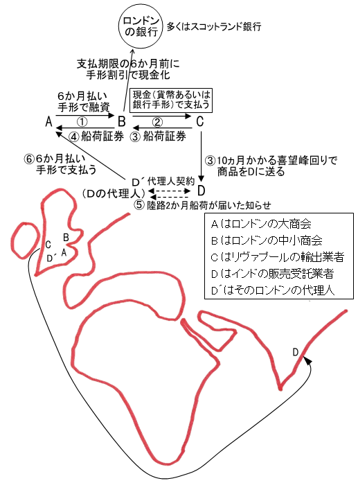 リヴァプールの輸入業者Aはインドの綿花輸出業者のロンドンの代理人Bに綿花を注文する注文書を(3枚複写で1枚はAの手元に、2枚をBに)出す。Bは注文書を(1枚は手もとおいて)陸路2か月でインドのBの本店に送る。インドのBの本店は綿花を船積みし、船荷証券とともに納品書を(3枚複写で1枚はBの本店の手元に、2枚をリヴァプールの代理人Bに)送る。リヴァプールの代理人Bは納品書(1枚手もとにおいて)と船荷証券をもって輸入業者Aを訪れ、Bが受取人で10か月後が満期の自己受け手形にAの引受署名をしてもらう(Bが手形を振り出す)。Aはその8か月後(喜望峰経由の海路は10か月かかるものとする)にリヴァプールに到着した船から、船荷証券と引き換えに綿花を受け取り、手形が満期になる2か月後までに綿花市場で売りさばいて利益を上げる。輸入業者Aとインドの綿花業者のロンドンの代理人Bはともにロイヤル・バンク・オブ・リヴァプール(以下RBLと略す)に当座預金口座を持っていて、Aは手形が満期になる前に自分の口座に売上金を現金で入金する。Bは手形が満期になってから手形をRBLに持ち込んでAの口座からBの口座に振り替えれもらう。Bが満期前に手形をRBLに持ち込めば、RBLは割り引いて(利子を取って)Bの口座に「前貸し」する。BがRBLに口座を持ってなければ、RBLはBに貨幣を渡すことになる。Aのような輸入業者はは、インドの綿花のほかに例えばブラジルのコーヒー豆、アメリカの良質な綿花、カナダのメープルシロップ、西インドのインディゴなども同じように輸入していて、それらの代理人たちによってA引受の手形がRBLに持ち込まれました。