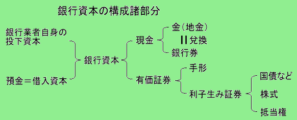 銀行資本(銀行業者資本)の構成は前28章でも繰り返し触れていますが、「利子生み資本」について28章では違っていたマルクスとエンゲルスの説明が、ここでは統一されています。マルクスの言う「銀行資本の構成諸部分」は下図のようになります。