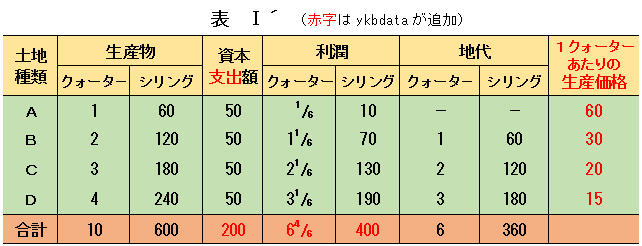 ここでは労働の生産力(この表現にはykbdataは異論があることは最初に述べました)が最も低いと評価される最劣等地Aの利潤10(シリング)は2/3クォーターの小麦を表しているが、労働の生産力が最も高く評価される最優等地Dではたったの1/6クォーターの小麦でしか表されないと言っているのだと思います。