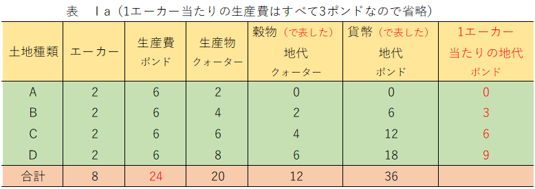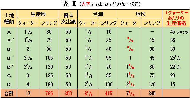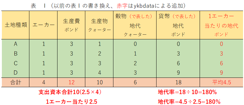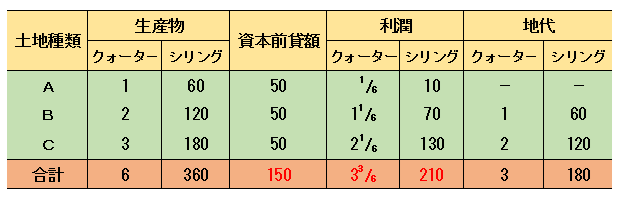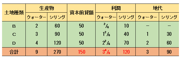4つの表のすべての場合に共通するのは、土地種類ごとの1エーカー当たりの地代(マルクスの表の一番右に赤字で追加表示)は同じままであることです。すなわち、土地Aの地代はどの場合もなし、土地Bの地代はどの場合でも1エーカー当たり3ポンド、同様に、土地Cは6ポンド、土地Dは9ポンドで変わりません。