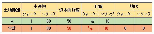 耕作が最劣等地Aから始まったとすると、Aでは1クォーター60シリングすなわち利潤10で生産されて超過利潤は生まれません。