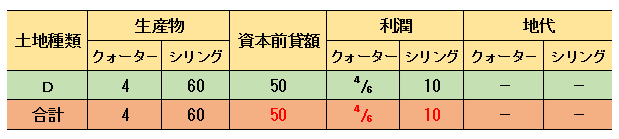 マルクスの話を分かりやすくすると、小麦の需要は、最初に最優等地Dで生産される4クォーター(1クォーターは約290リットル)の生産価格が資本+20%の利潤=60シリング(1クォーター15シリング)、利潤は10(利潤率20%)で満たされます。超過利潤はまだ生まれません。