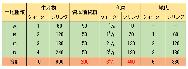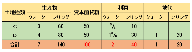次に小麦への需要はそれを超え、小麦の価格が1クォーター20シリングまで騰貴すると、Dより豊度の低い土地Cの耕作により3クォーター60シリング(1クォーター20シリング)が供給される。この時、Cの利潤は10(利潤率20%)だが、Dの利潤が30(利潤率60%)すなわち超過利潤20が生まれます。