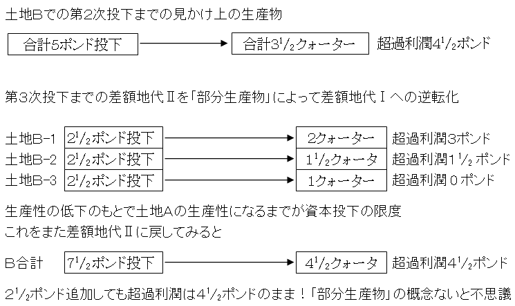 「それよりもはるかに重要なのは、同じ土地で資本投下がくり返し行われる場合の総地代にかんする帰結…ありうる場合の大多数において、地代は、土地への資本投下の増加の結果、地代を生む土地の1エーカーあたり(地代率*ykb)でも、またことに地代の総額においても、増加することを意味している」