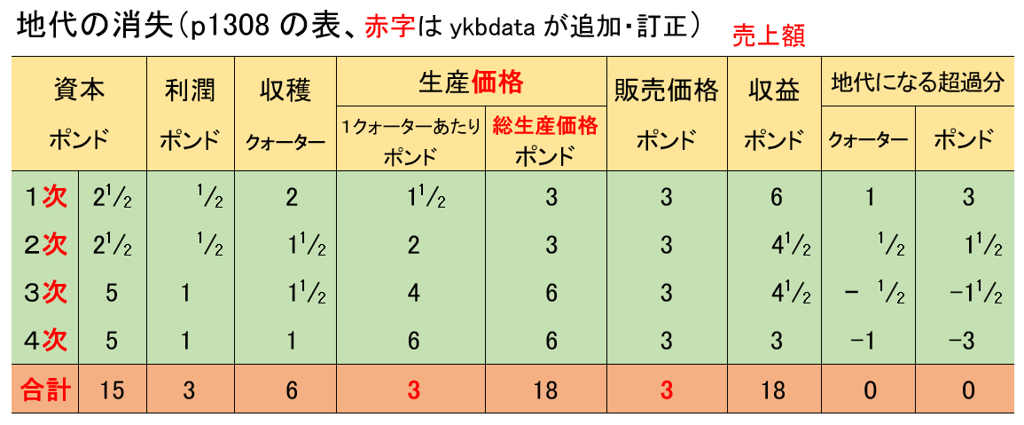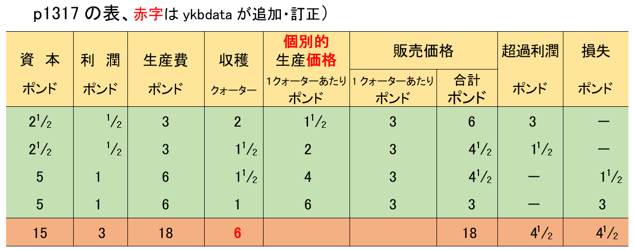 なお、p1306の訳注*1の中の第4次投下の生産価格4ポンド(平均利潤20%を含む)から資本投下を31/3ポンドとしていますが、どう計算しても4×4/5=31/5ポンドにしかならないのですが、ykbdataの計算違いでしょうか。