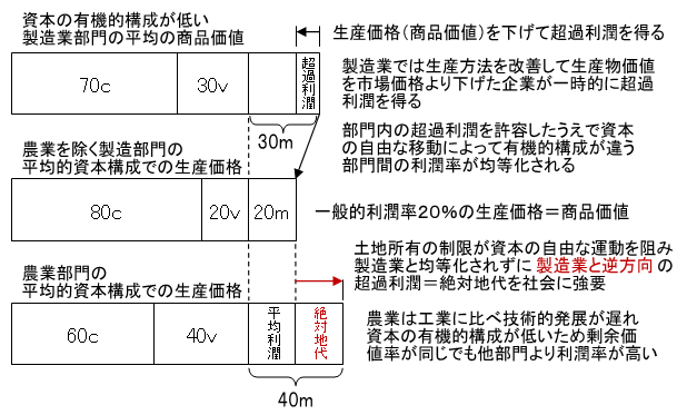 しかしここでは、第二篇で考察された諸生産部門間の利潤率の均等化のもとでの、部門内の超過利潤の許容が法則的に説明されたうえで、「とはいいながらこの前提(部門間の利潤率の均等化=一般的利潤率の成立*ykb)」は資本の生産部門間の自由な移動(新規投下や撤退を含めるとマルクスの言う「自由な運動」が正しい)を前提とているが、土地所有を前提とする農業部門では資本の自由な運動が制限され、(生産価格より生産物価値を引き下げることによって生じる)部門内の超過利潤とは逆に、生産価格を生産物価値が超えることで部門間での超過利潤、すなわち絶対地代が生じると解明します。