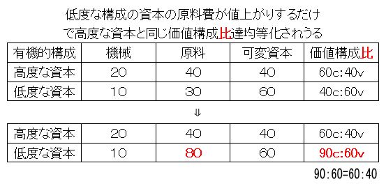 次に資本の有機的構成について、数字をあげて、高度な資本と低度な資本について、低度な資本の原料費が高騰しただけで、価値構成比は均等化するという話は下表です。