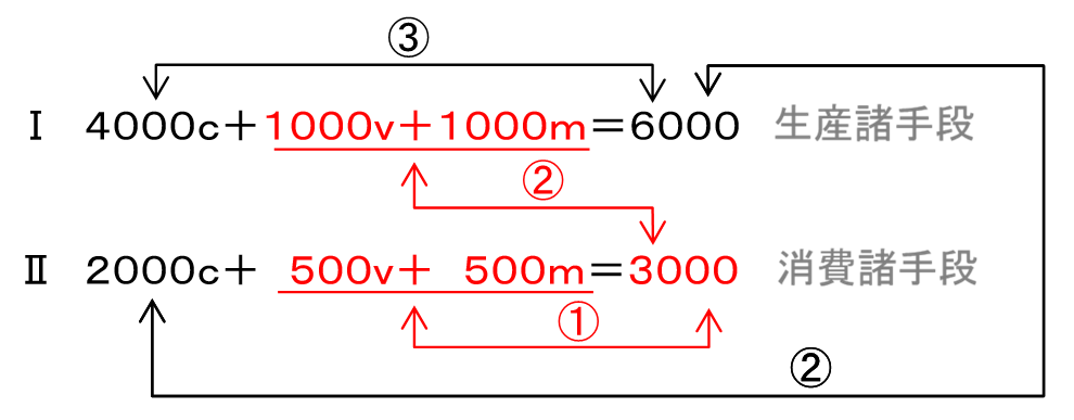 一つは、生産物価値から労賃(可変資本)および、利潤と地代を合わせた剰余価値部分を除く、不変資本部分を誰が買うのかということ、もう一つは、この不変資本部分を誰が生産するのかということです。これは、二大生産部門に分けることで解決するわけです。