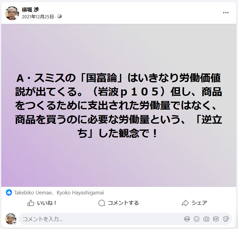 A・スミスの労働価値説も次のように転倒していて、不変資本価値が見えていません。